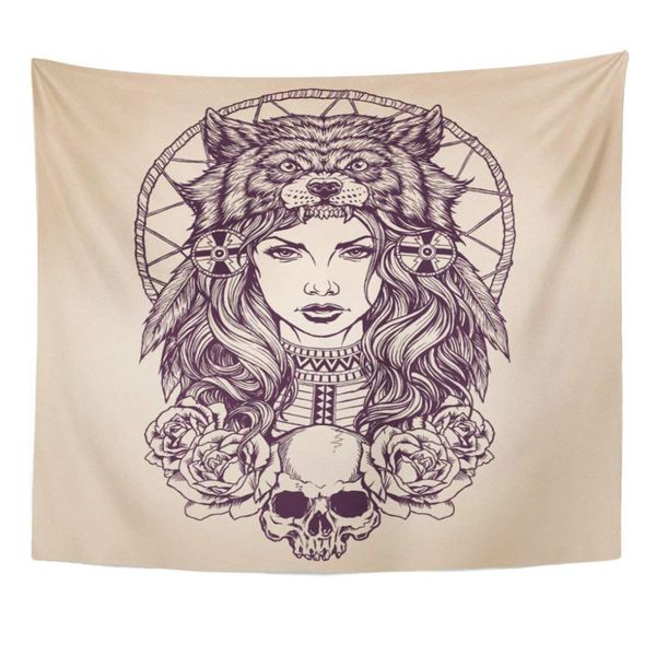 Tapestry Red Tattoo Native American Girl With Wolf Headdress Lineart Indian Woman Home Decor Wall Hanging For Room Huge Tapestry Huge Tapestry Wall